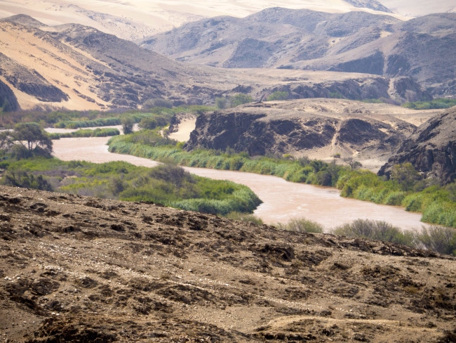 The borders of Namibia with its neighbours follow age old rivers for the most part. The Orange River marks the border with South Africa and the Kunene River, to the North, the separation with Angola. Up in the mountains above Serra Cafema Camp, we could see Angola across the river. Its landscapes were similar in that part of Africa.