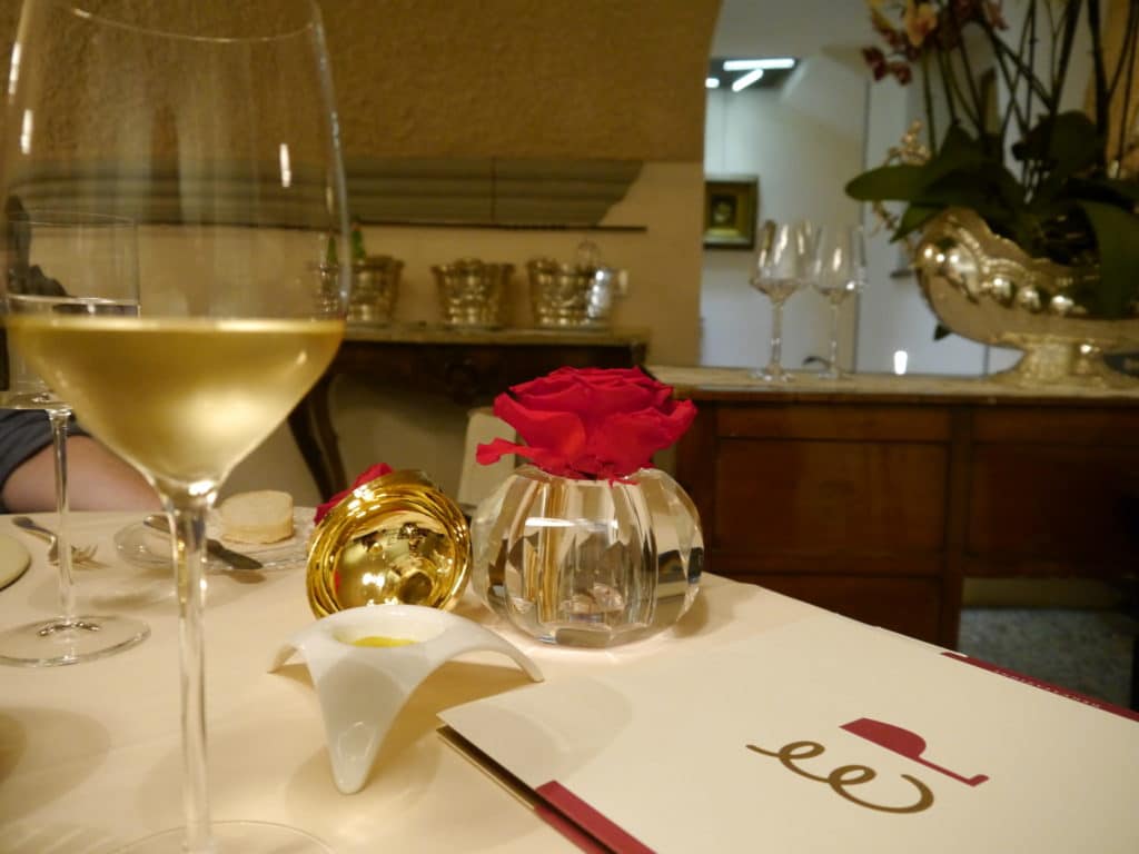Enoteca Pinchiorri used to be in an old rather grand palace that has been converted into a Relais and Chateaux 5* Hotel. The entrance is romantic, aligned with Florence’s artistic and erudite past, but the sofa we were told to sit on felt “on the way” to somewhere. A few people looked at us and it all felt as if they did not know what to do with us and something was wrong. “Maybe I should be wearing a tie?”, wondered my friend, or maybe we should be more dressed us? I asked myself looking down at my relatively casual trousers and shoes. Eventually, without much attention or the service level that one should expect at such places, we were directed through corridors, narrow stairs and up to a balcony style small room with four tables. We were indeed the first ones, and it seemed that we had been placed in the only room for foreigners, as everyone downstairs looked local whereas our room eventually filled with three party-dress Chinese girls, a Chinese young couple dressed in tracksuit pants and a selfie stick, and another older couple.