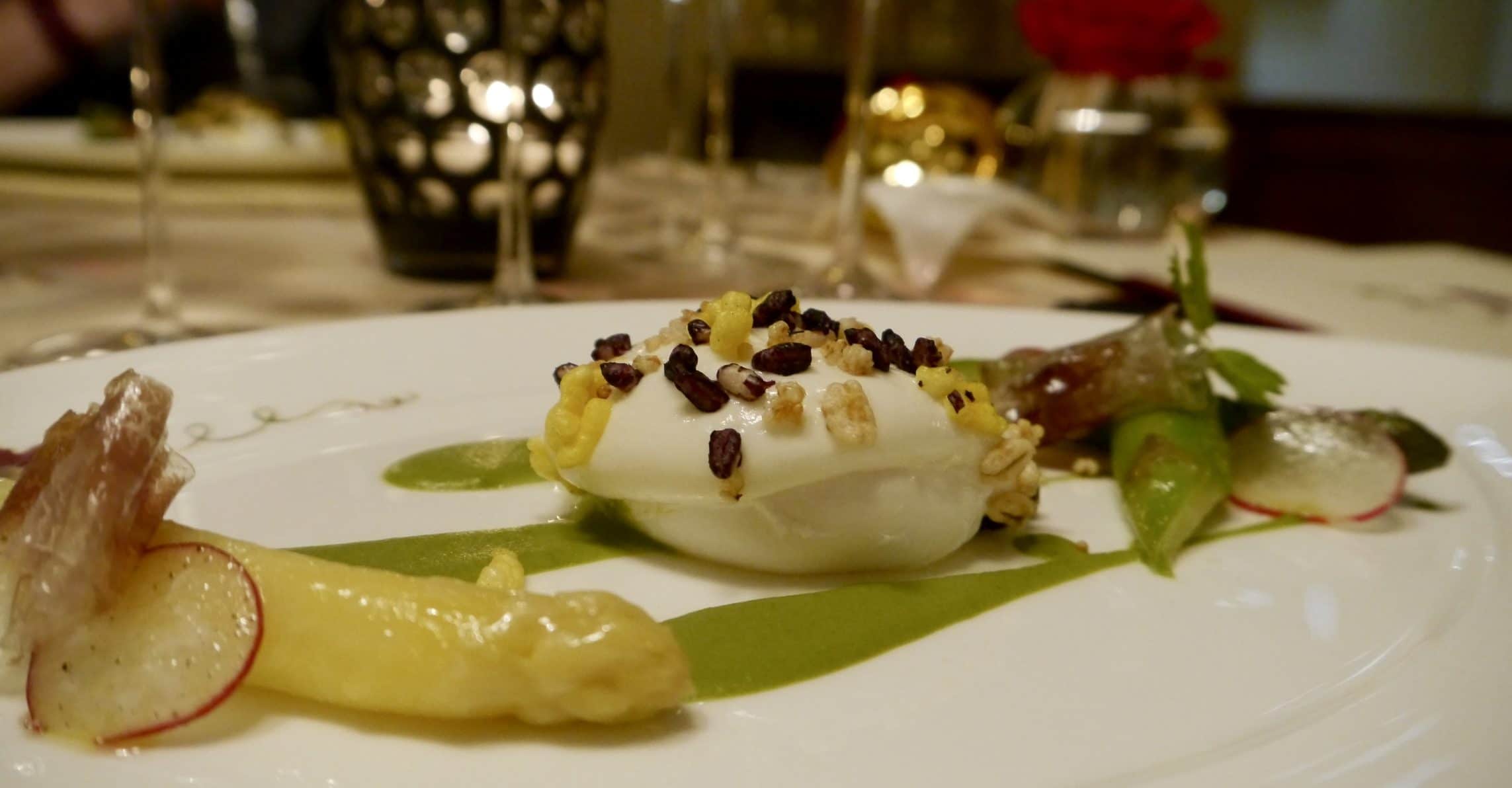 The menu choices included an a la carte selection and three menus, one Spring degustation, one degustation of the a la carte menu plus an optional selection of 3 add-on dishes to “transform the menu into a unique experience”. Given the prices of the starters ranged between 50 euro for the humble poached eggs to 90 euro for the prawns, taking the degustation menu was a no brainer. We were already breaking the bank so we decided to add the three optional dishes to “transform” our experience. I was rather intrigued as to what those three dishes would do.